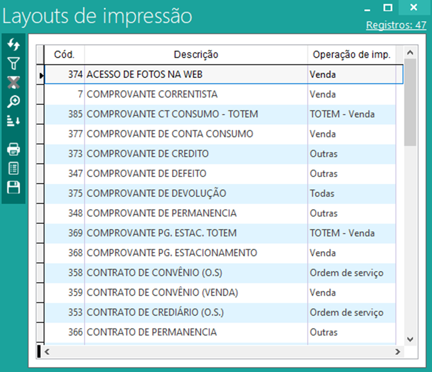 A tela de layouts de impressão mostra quais são os layouts ativos no sistema atualmente. Ou seja, ao tentar realizar a impressão de uma página o Vixen irá utilizar um layout aqui já predefinido.