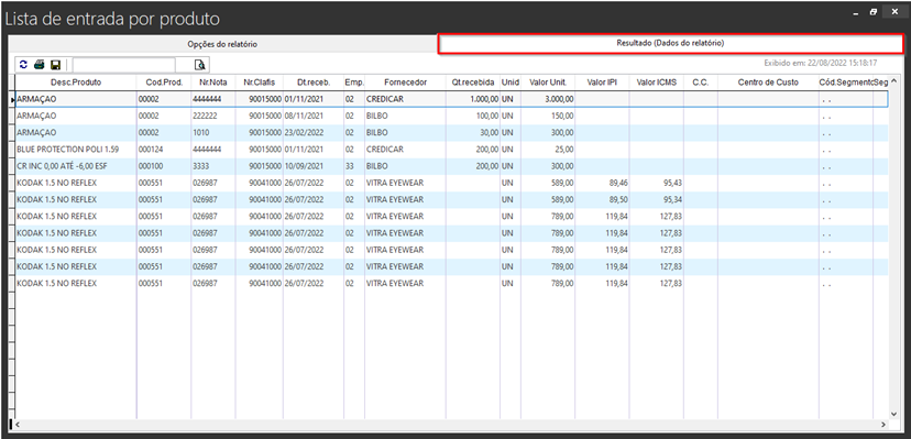 Esse relatório lista todas as entradas de notas fiscais feitas no sistema, com as informações de descrição do produto, número da nota fiscal gerada, Data recebimento, e outras informações fiscais relacionado ao produto.