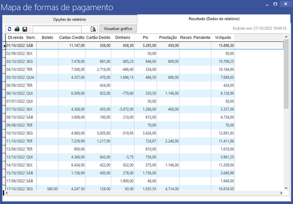 Através da tela “Mapa de formas de pagamento” é possível obter um relatório que nos mostra todas as formas de pagamento utilizada em sua loja mês a mês. Com isso podendo lhe ajudar a mapear as formas de pagamento mais utilizadas em sua loja, podendo lhe ajudar em uma tomada de decisão, com aumentar o número de máquinas POS, caso tenha um alto número de vendas em cartão de crédito/débito.