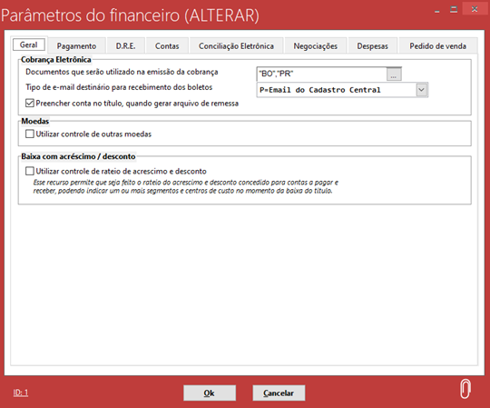 Na guia geral, temos algumas opções de configuração como a parte de cobrança eletrônica onde podemos configurar como documentos que serão utilizados na emissão da cobrança e preencher conta no título, quando gerar arquivo de remessa. Baixa com acréscimo / desconto onde podemos alterar a opção de utilizar controle de rateio de acréscimo e desconto