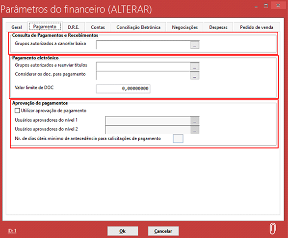 Na guia pagamentos temos as opções de grupos autorizados a cancelar baixa, grupos autorizados a reenviar títulos, e algumas opções de aprovação de pagamentos: