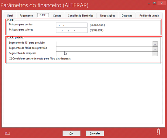 Na guia DRE temos algumas configurações como máscara para contas, máscara para vendas, configurações de segmentos etc.: