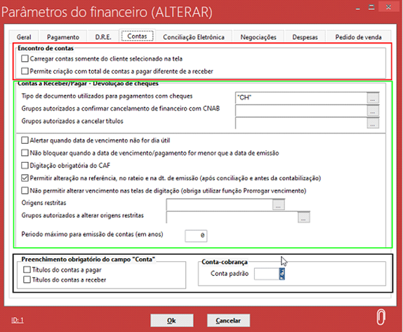 Na tela “Parâmetros do financeiro” temos a possibilidade de fazer algumas configurações do comportamento do modulo financeiro, como configurações de pagamento, D.R.E, Contas, Conciliação eletrônica, dentre outras coisas.