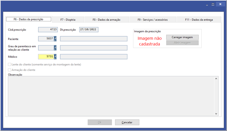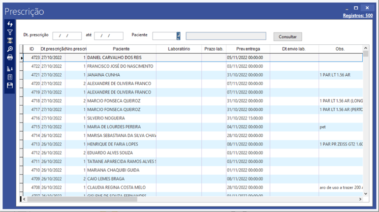 A tela “Prescrições” é um relatório onde podemos realizar a consulta de todas as prescrições que foram incluídas no sistema, exemplo, na inclusão de uma O.S. pelo Vixen podemos realizar o cadastro de uma prescrição para que possamos visualizar as informações anexadas a ela.