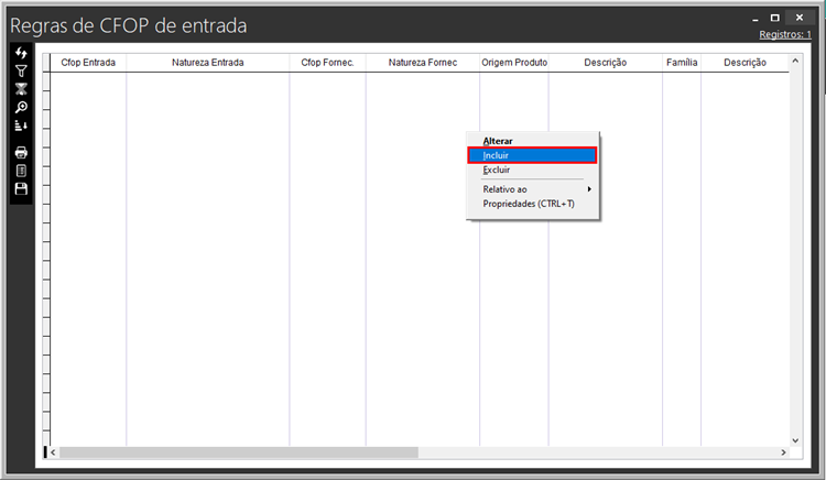 Para incluir um novo registro, basta clicar com botão direito e “Incluir”.