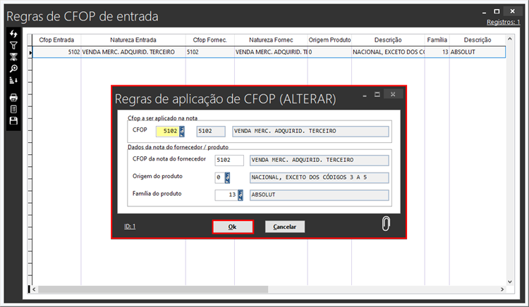 Então preenchemos as informações de CFOP a ser aplicado na nota, CFOP da nota do fornecedor, origem do produto, família do produto, e o regime da empresa e então “Ok”.