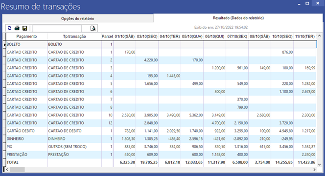 Esse relatório traz um resumo das transações ocorridas no caixa de forma resumida, limitando o período de busca de até 31 dias corridos. Nele é possível consultar os valores, formas de pagamento e quantidades de parcelas de recebimento de todos os documentos cadastrados no sistema. Também é possível consultar os valores das movimentações de caixa, como sangrias e fundos de caixa efetuados dentro desse período.