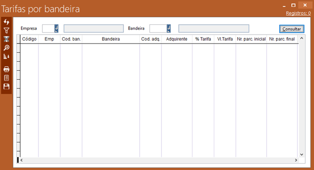 A tela “Tarifas por bandeira” tem como objetivo cadastrar as tarifas de cartão de crédito/débito de acordo com a bandeira/adquirente utilizada pelo contribuinte.