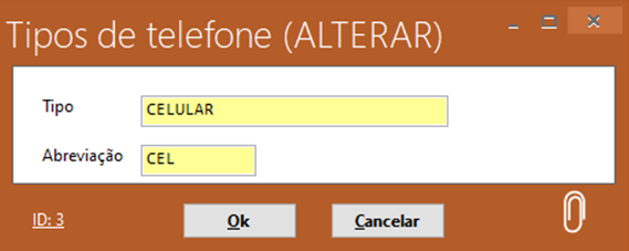 A tela “Tipos de telefone” é utilizada para cadastrarmos os tipos de telefone que iremos utilizar no cadastro central, como por exemplo: Telefone, celular, fax etc.