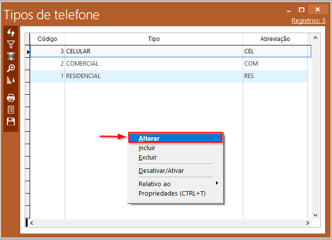 Ao abrir a tela em questão, vamos nos deparar com uma lista dos tipos de telefones já cadastrados no sistema. Para realizar a inclusão ou alteração do “tipo de telefone” basta clicar com o botão direito no mouse e selecionar a opção “alterar” ou caso desejar criar um novo “incluir” no menu de contexto que irá se abrir. Em seguida, vamos precisar preencher alguns campos para realizar o cadastro desse novo tipo de telefone: