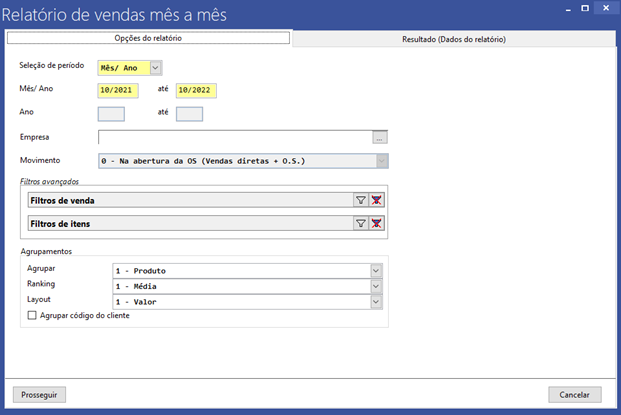 Mês/ano: Definir de o espaço de tempo que o relatório irá filtrar os dados