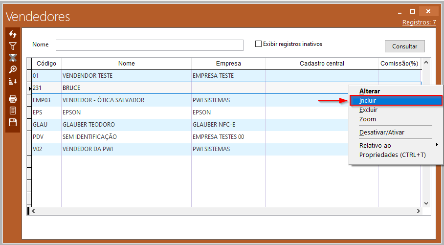 Ao abrir a tela em questão, vamos conseguir visualizar os vendedores já cadastrados no sistema, e vamos ter a possibilidade de cadastrar novos. Para cadastrar um novo vendedor, basta clicar com o botão direito no mouse, e no menu de contexto que irá se abrir, vamos selecionar a opção “Incluir”. Com isso, será aberta uma segunda janela, para que possamos configurar as informações do nosso novo vendedor: