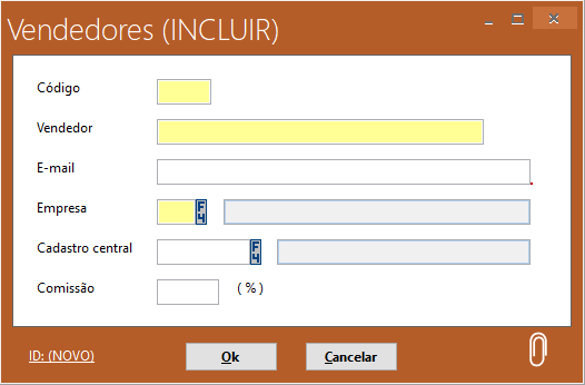 Ao incluir um vendedor, devemos indicar obrigatoriamente seu código identificador, vendedor e empresa, sendo opcional o e-mail, cadastro central e comissão.